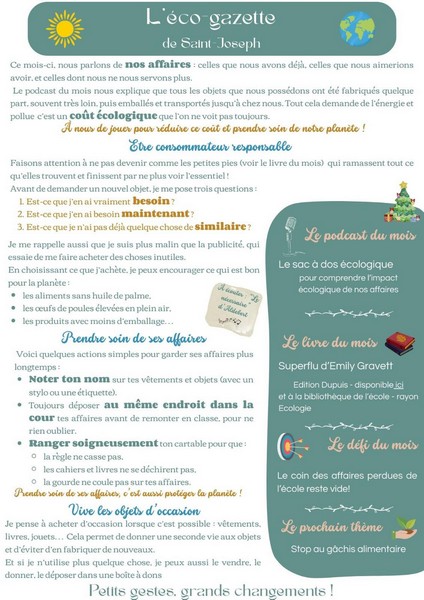 Ce mois-ci, l’éco-gazette invite les élèves à réfléchir à leur manière de consommer. Nous les encourageons à adopter trois attitudes essentielles : réfléchir avant d’acheter, prendre soin de leurs affaires, et donner une seconde vie aux objets.